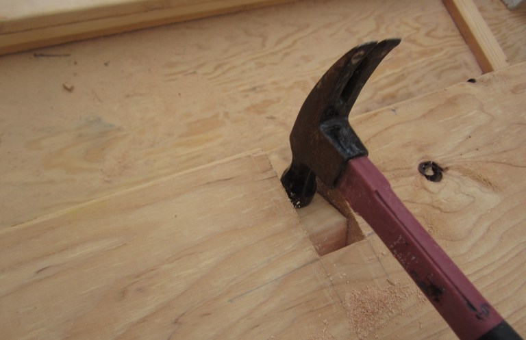 ...the hammer is used to knock the wood out to make a notch: