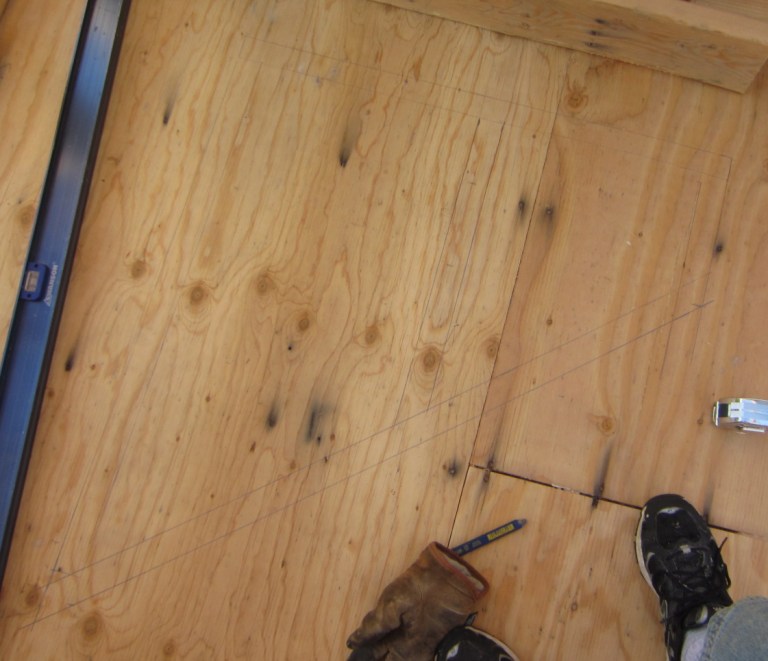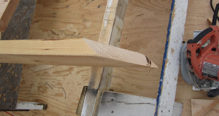 May 2. To make the little rafters for the dormer roof, I drew one full size on the dormer floor, then cut one out from a 2x8. This will be my template: