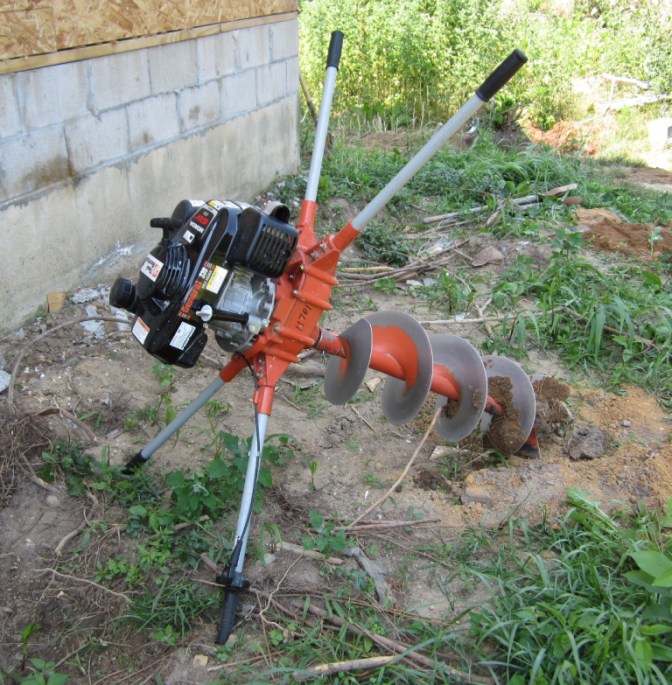 It weighs about 100 pounds. Add a bit full of dirt and it is quite a workout pulling earth out of the ground. This auger performed better, probably because we had already dug 8" holes, but also because it is a more powerful machine. We dug out all the 8" holes to make them 12".