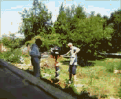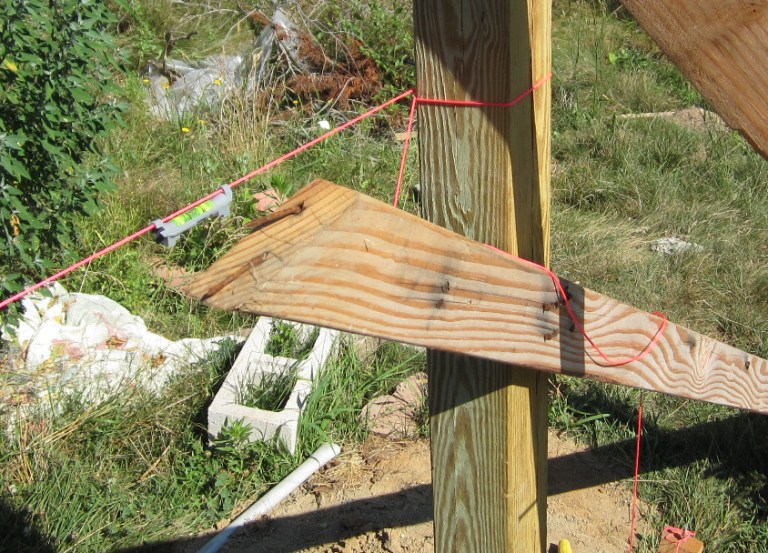 July 6. We set posts on the east and west sides. I determined the post height of an end post by temporarily nailing a level joist to it and measuring down from the top of the joist. I allowed 7 1/4 inches for the 2x8 joist and 9 1/4 inches for the 2x10 beam the joists will sit on. Then I pulled a mason's line to the next corner. This works OK for short runs, but a string will always sag a little: