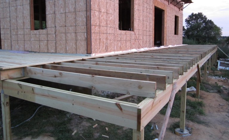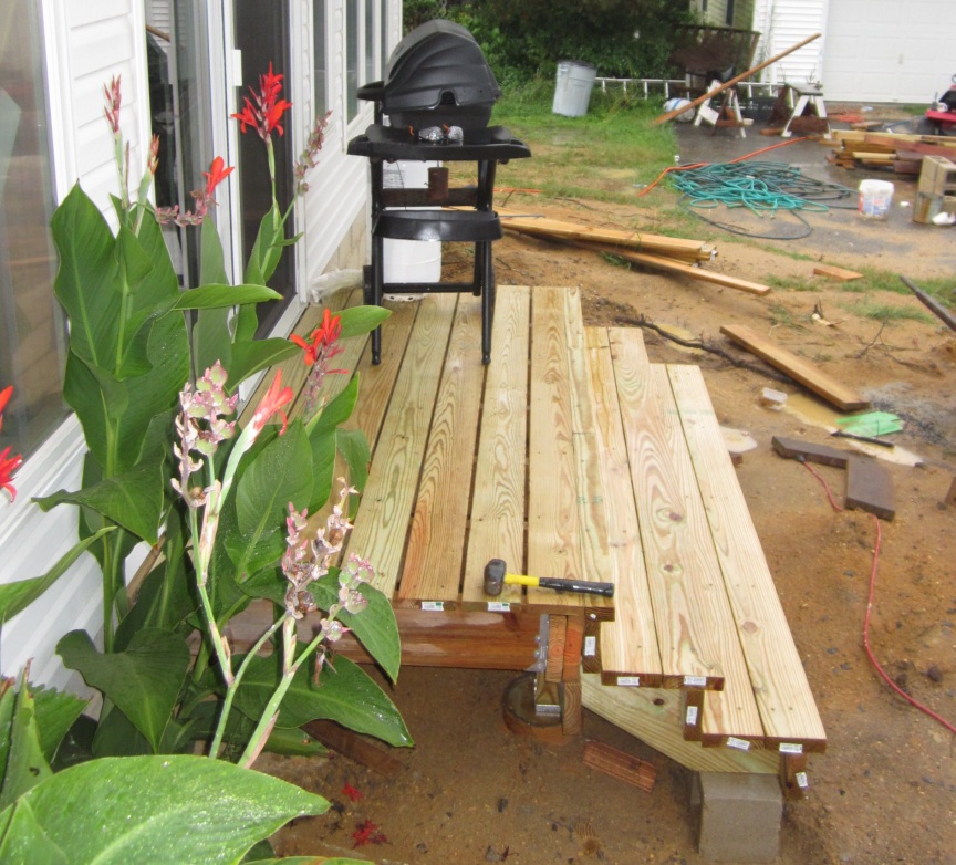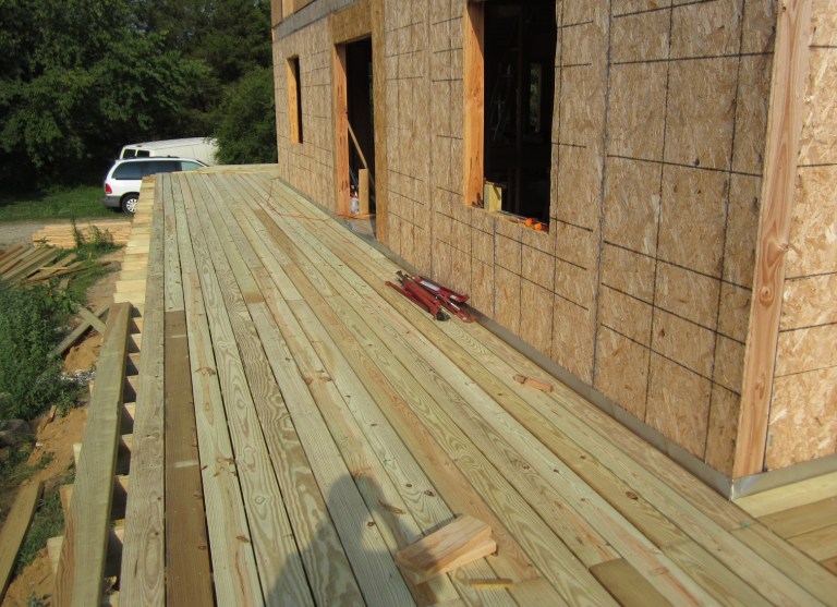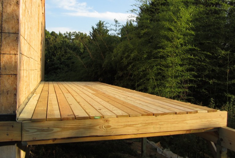 July 7. We hung all the joists on the west side and nailed on the first deck board: