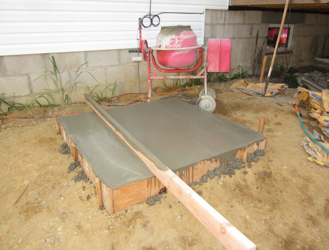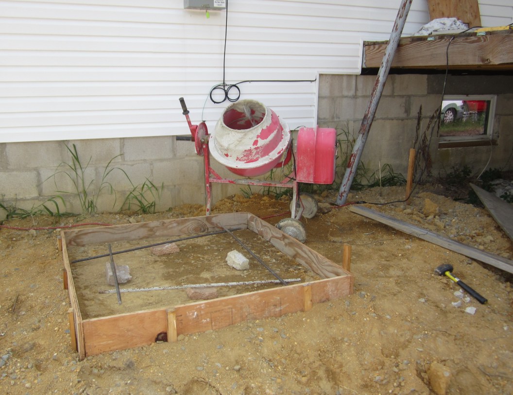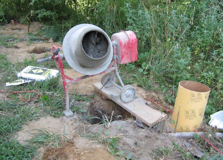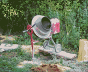 July 4. We gained independence from concrete pouring this morning. The mixer is now slightly used. Here it is churning away: