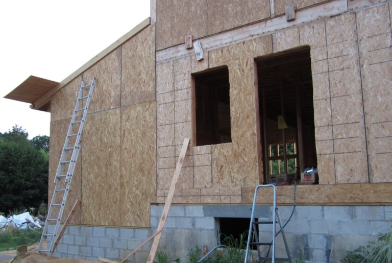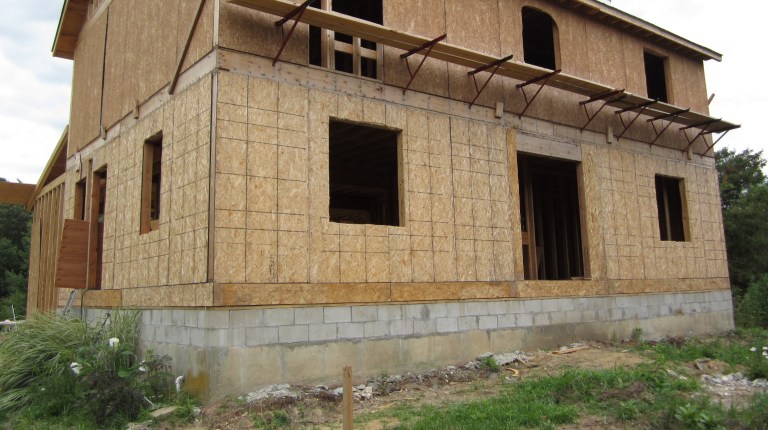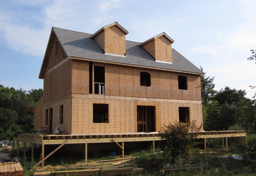 Here is a front view. Note the front scaffold is down and we finished OSB details on the east side: