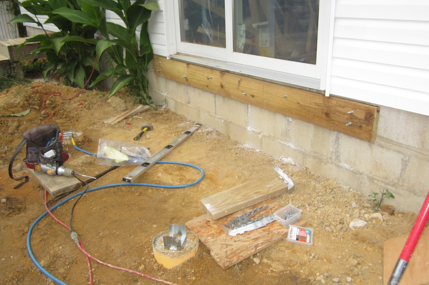 Though not part of the porches, I also had to build a small deck off the back sliding door. I include that here. Ledger board anchored to the wall: