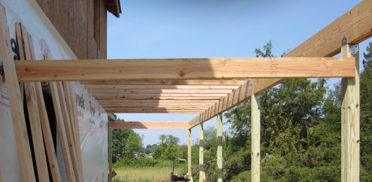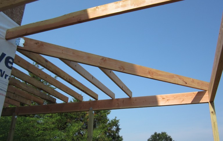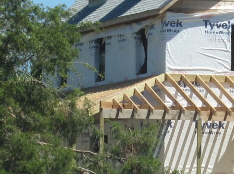 July 23. We finished all the common (full length) porch rafters today. Now I have to figure out how to do the corners. Here is a view of the east rafters: