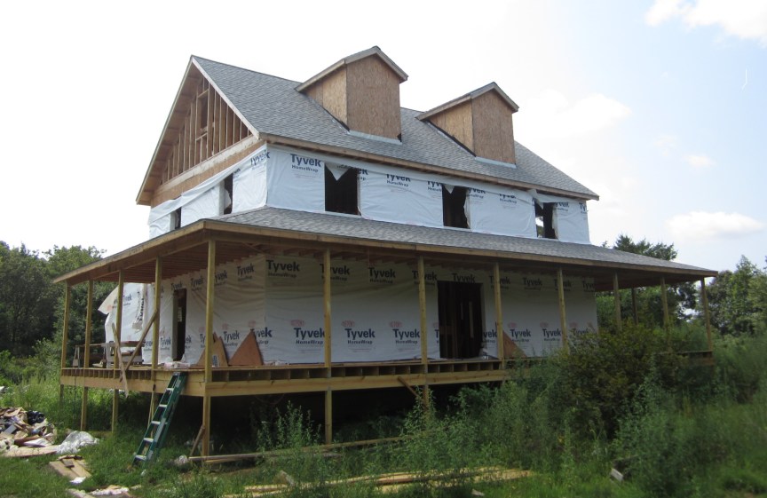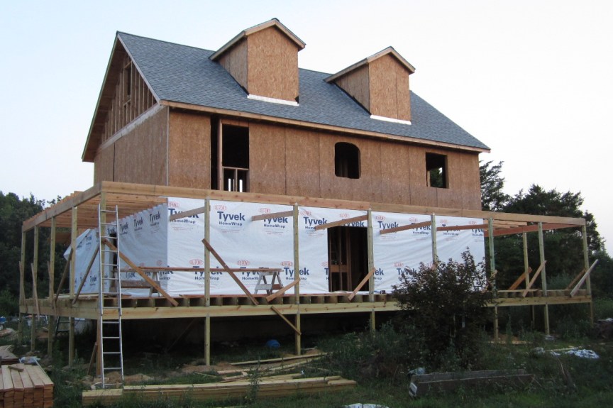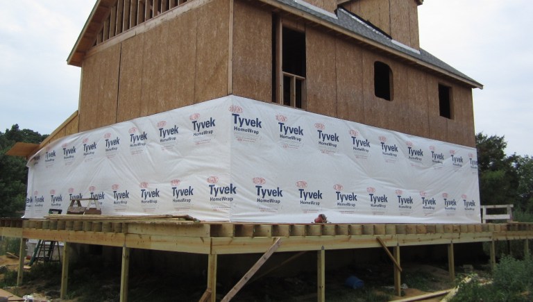 July 13. We finished filling in OSB on the walls of the first floor. I went around and checked all the walls and shot a few more nails to make sure the sheathing had enough nails. Then we wrapped the first floor with Tyvek: