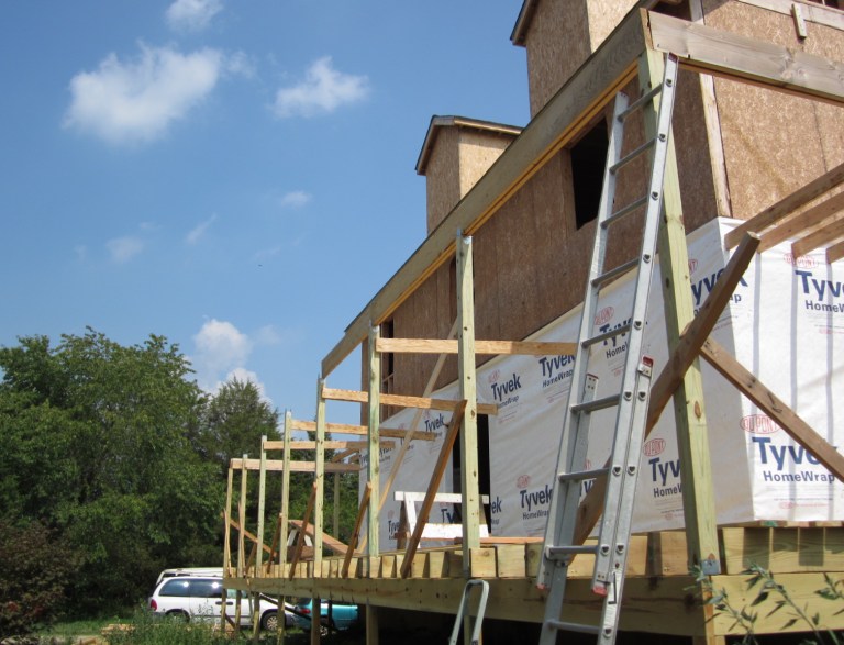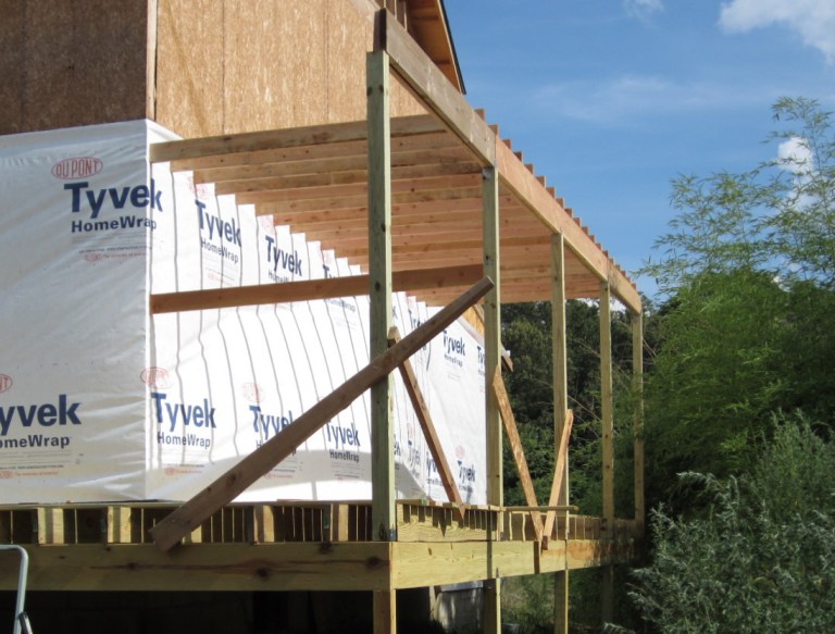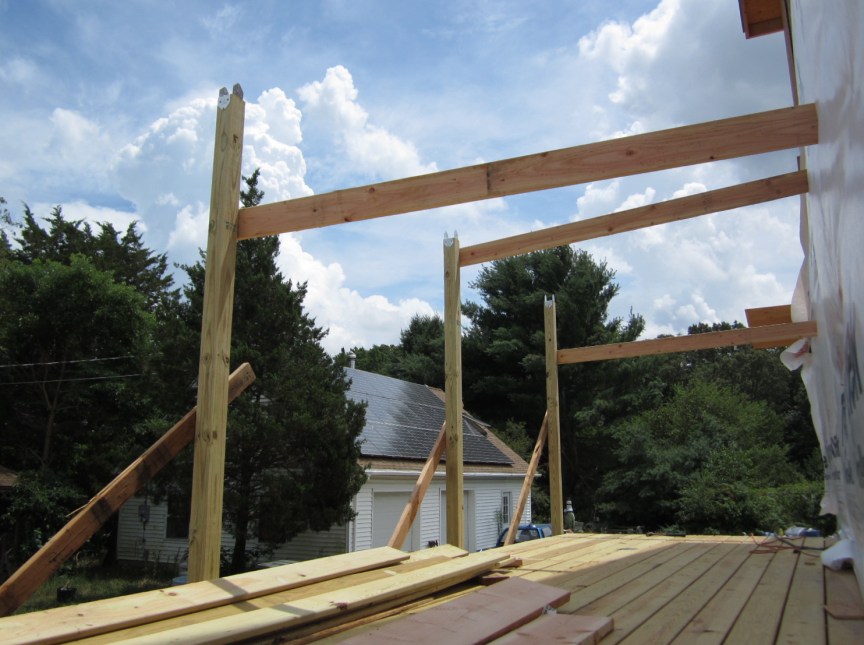 July 14. After great suffering, wondering what kind of post and railing system to use, I went with pressure treated 4x4 posts. The other option: structural vinyl posts and vinyl railings. I went with wood because it's wood. Real wood. And wood is very much less expensive than vinyl. Here is the west side with braced posts sitting in metal post bases on the beam. We plumbed the posts and braced them with 2x6's toe nailed to the wall, then set the first 2x10 headers on the posts. We toe nailed the first ceiling joists and removed the braces under them. There is still a low brace on the first post in the back: