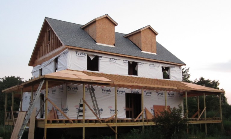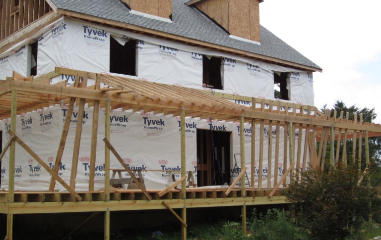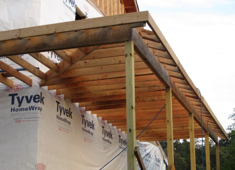 ...and on the front. Before installing the rafters, we installed Tyvek and ledger boards:
