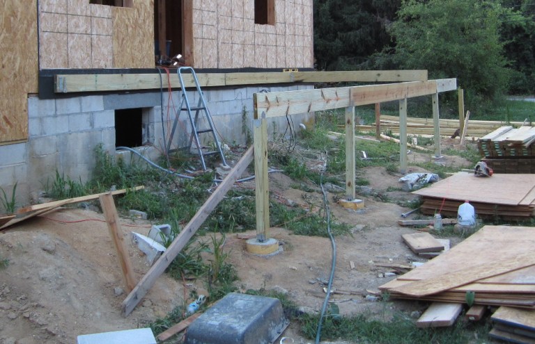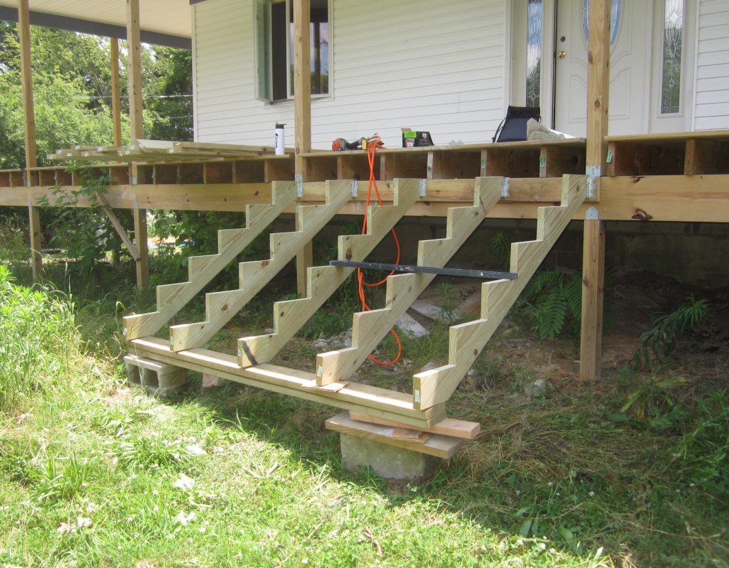 June, 2013. Back stairs and front stairs. To save time, I bought pre-cut stringers from the generic big box home improvement store. Since I had not yet graded the ground around the house, I had to use temporary supports for the steps. Back steps: