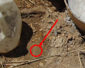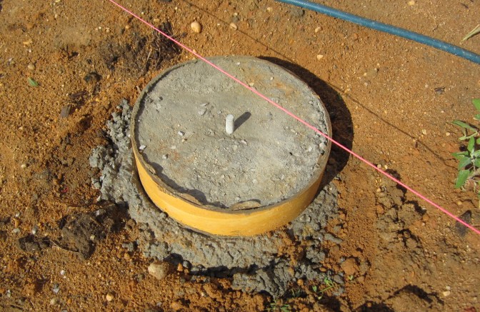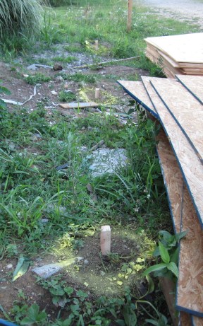 June 25, 2012. I measured 8 feet from the house wall and tapped in stakes 8 feet apart to mark for holes to be dug for concrete piers.