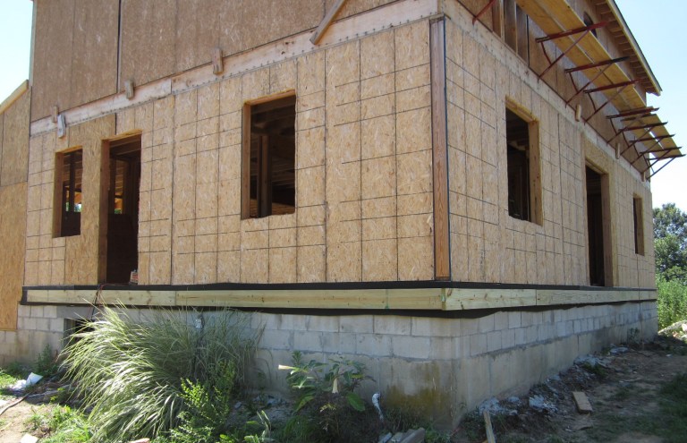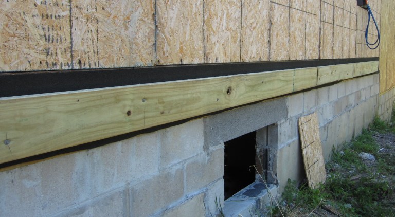 July 2. To keep the band joists forever dry, we stapled 1-foot wide strips of Weatherwatch ® to the first floor box: