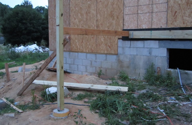 July 3, 2012. I cleared the vegetation away from the east side of the house and put up one temporary post to start porch framing: