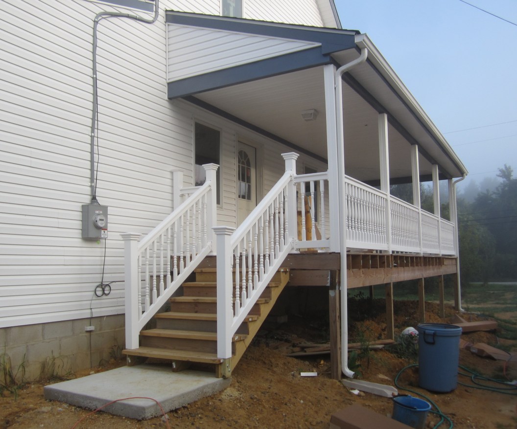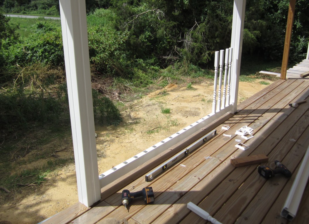 August, 2013. Back to the porches. We need railings everywhere. Vinyl is final. Here the first railing section goes up. Post wrap, rails and balusters. I got these from Great Railing in Williamstown: