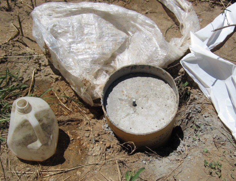 I ordered 50 more 80-pound bags of concrete. In the evening, we filled 6 pier holes. When will we be done pouring concrete? After filling the holes and setting the bolts, I covered the piers with plastic for a day. This keeps the concrete from drying too quickly. Here is a pier ready for its plastic cover: