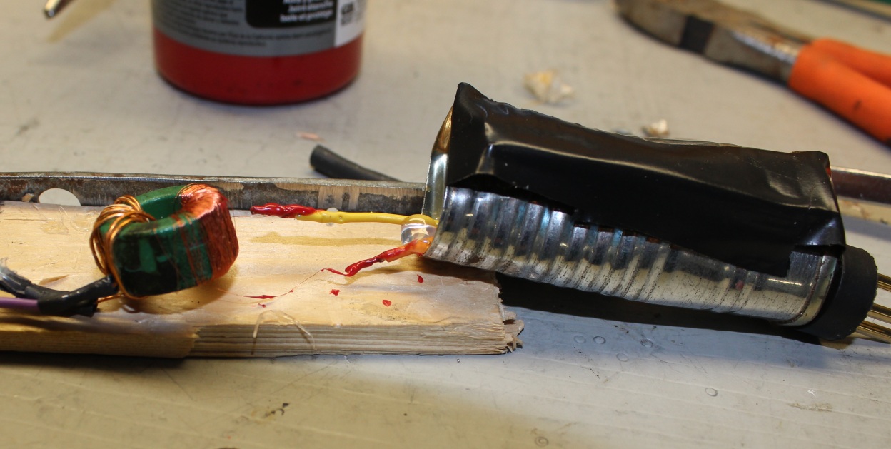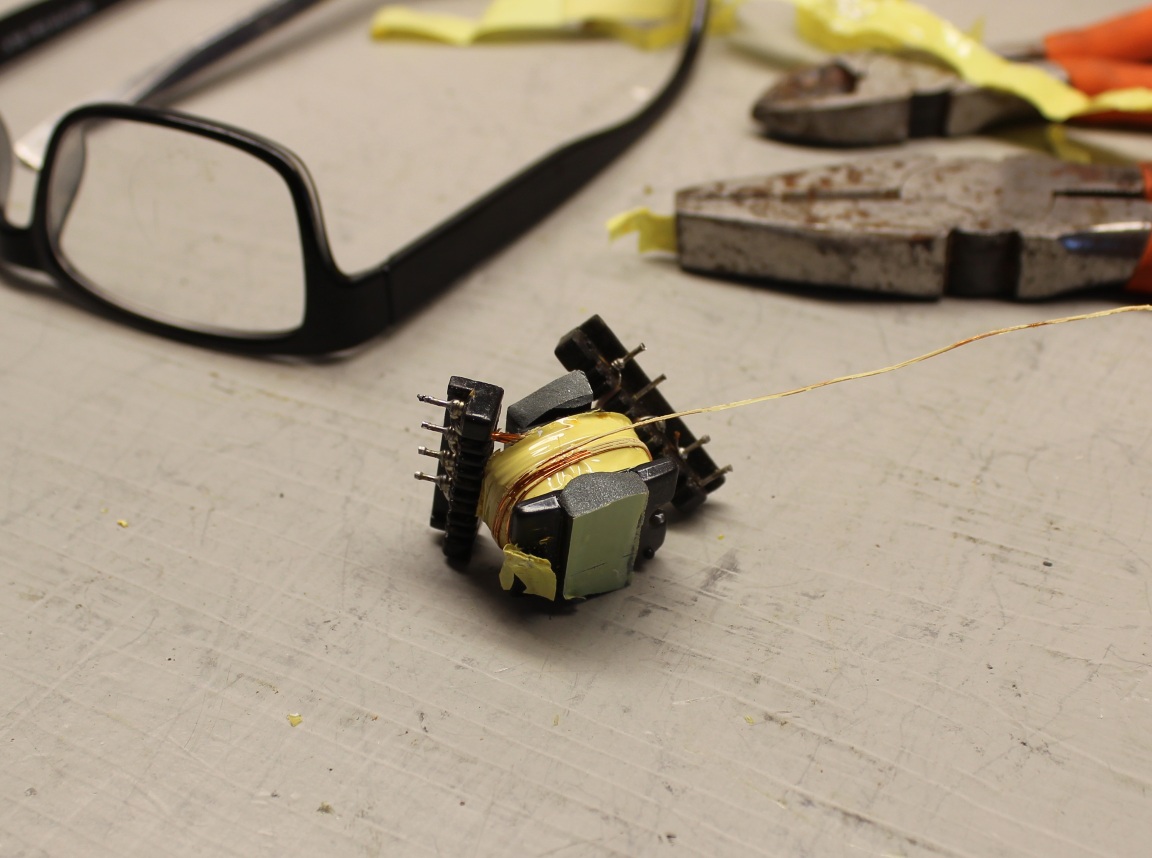 I threaded the bobbin through the hole in the torus, unwinding the wire from the bobbin as I went. I got about 35 feet of wire through before a tangle forced me to abort. I measured the resistance with an ohm metter, found it to be 46 ohms. I decided that was good for a first try. I estimated the number of turns to be about 240 turns based on the length of wire to make one turn. I decided on a 1:30 ratio and made about 8 turns with the 26 gauge magnet wire I scavenged from a scrap transformer, and I soldered bigger wires to the transformer wires:
