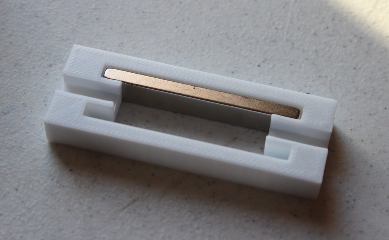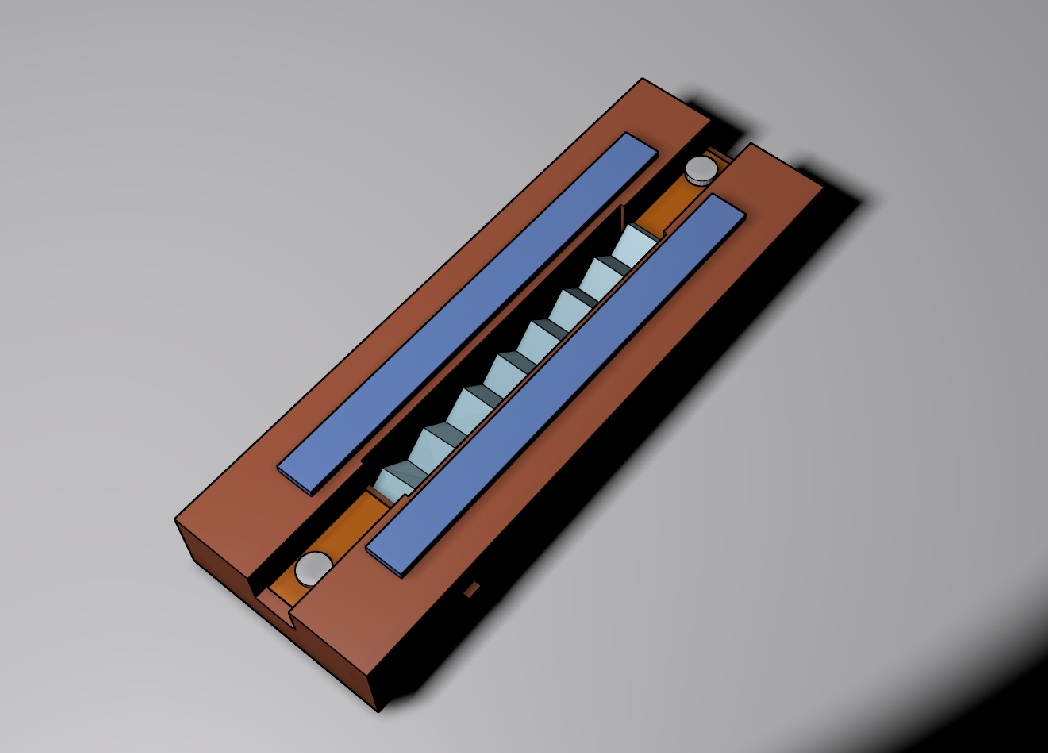 I ordered a set of 4 neodymium bar magnets from Amazon, 60 x 10 x 5 mm, for about $8. I designed the motor around the magnet dimensions. I drew the design on paper and tried to make the motor base from a piece of hard, thick, clear plastic, but the Dremel did not play nicely with it, melting and grabbing the plastic. So I went to the garage and found a scrap piece of oak flooring about 3/8" thick. I rough cut the shape with a band saw and radial arm saw, cut and glued the end piece: