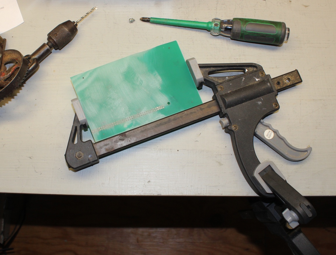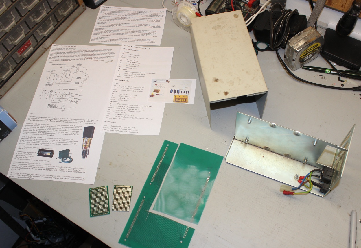 December 13, 2017. I found a nice heavy metal box in the garage. It's an old external hard drive case. I got a pack of little blank circuit boards from China and I have a collection of bigger boards (thanks, brother) from which I cut out a board for the power supply. To the left are some instructions, circuit diagrams and parts list from the original Tape Op article from issue #25. See my old web page for possible links.