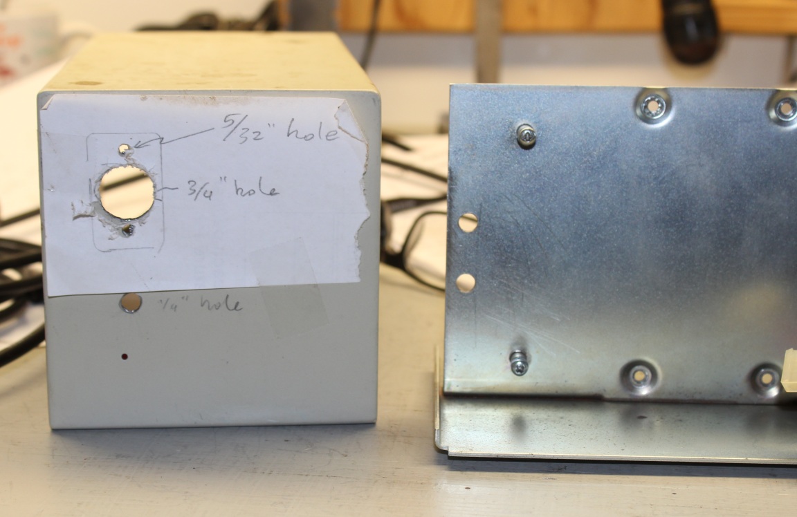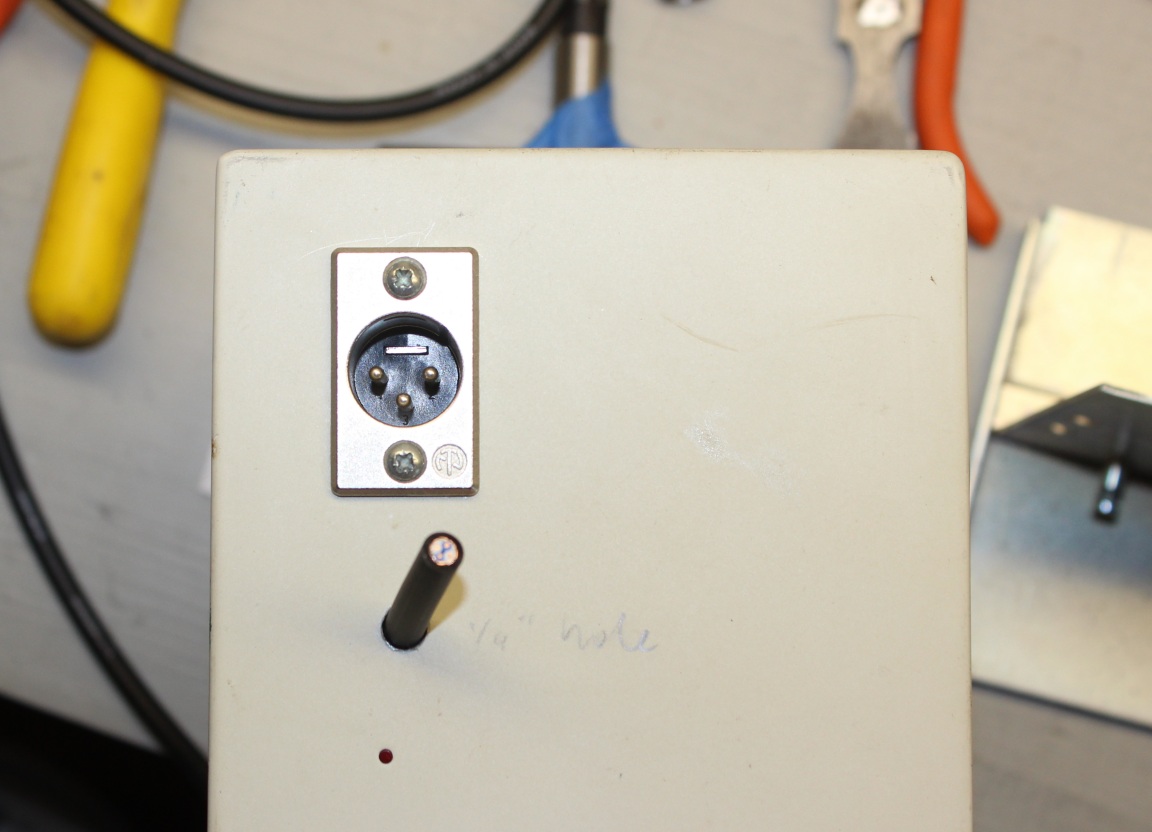 December 28. I drilled holes in the metal box for wires and the XLR jack and 1/4" holes on the metal partion inside the case. Later I hot-glued rubber tubing into the 1/4" holes to protect the wires:
