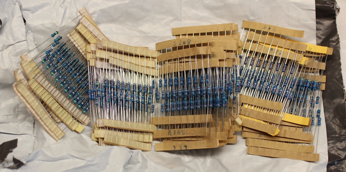 Just kidding, sort of. Many of the strips of resistors were poorly marked or unmarked. I used my ohmmeter to verify values or I read the resistor color codes, then marked each strip more clearly.